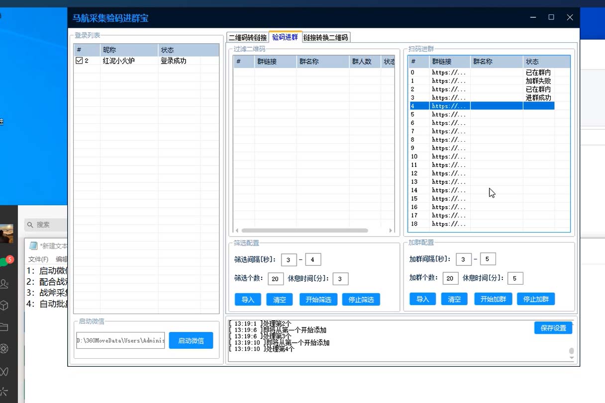 这个软件是微信加群辅助软件,只需要导入相应的微信群二维码,软件会自动去操作加群,软件需要配合咱们平台之前发布的战斧微信群二维码采集器使用